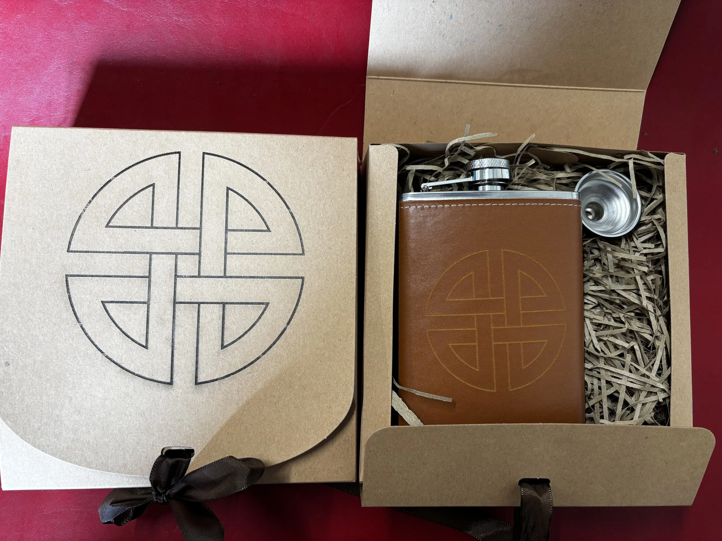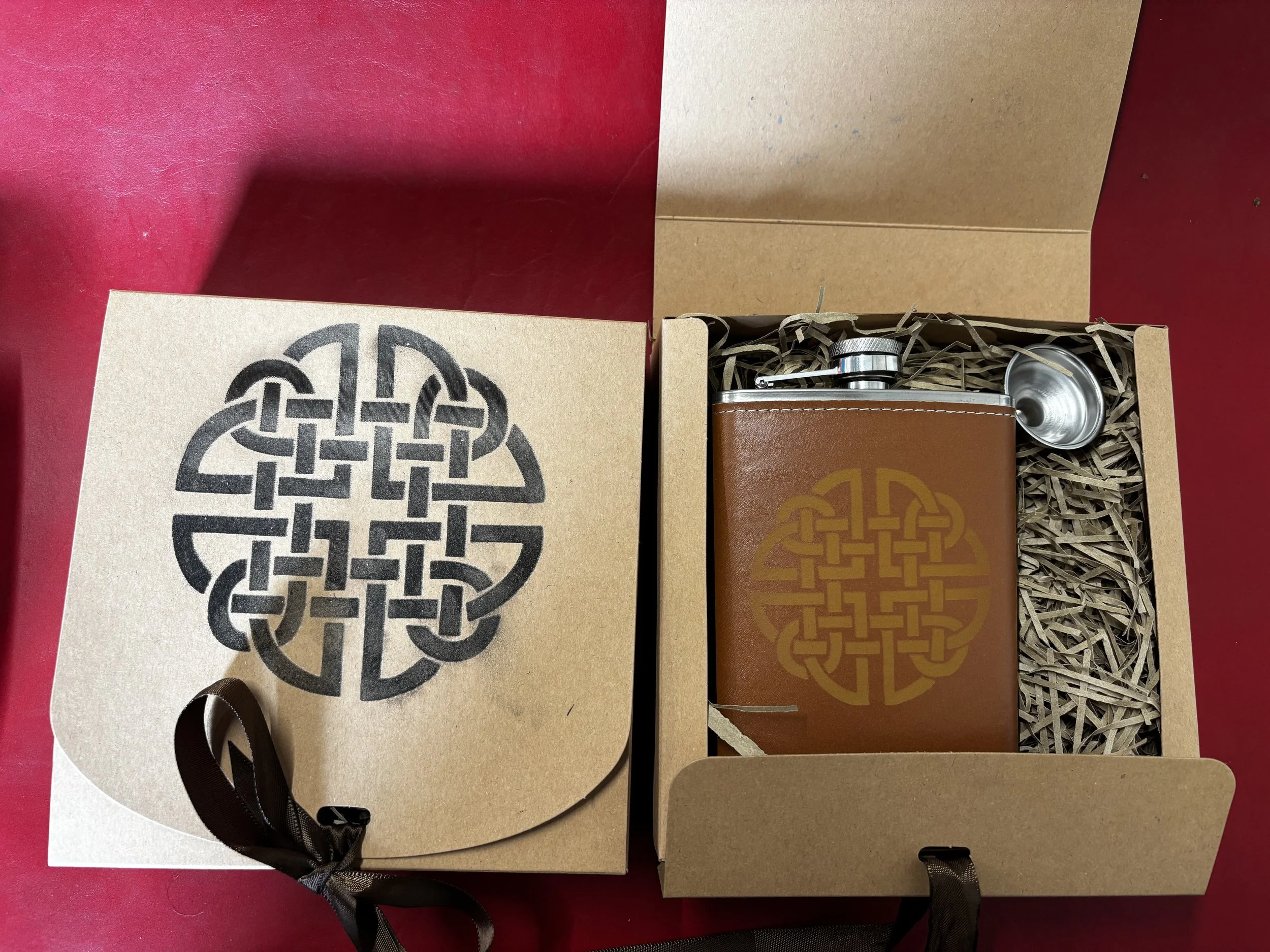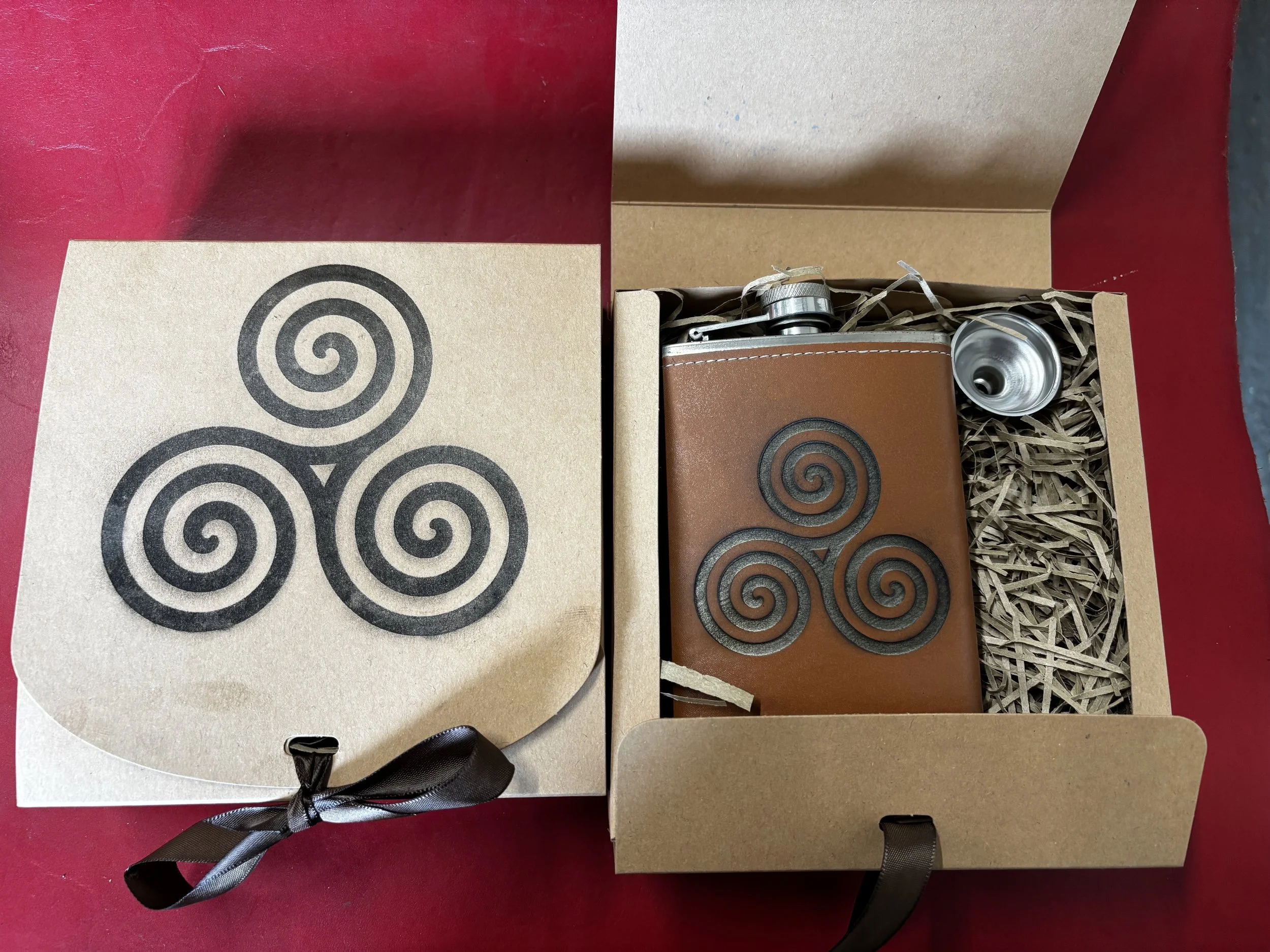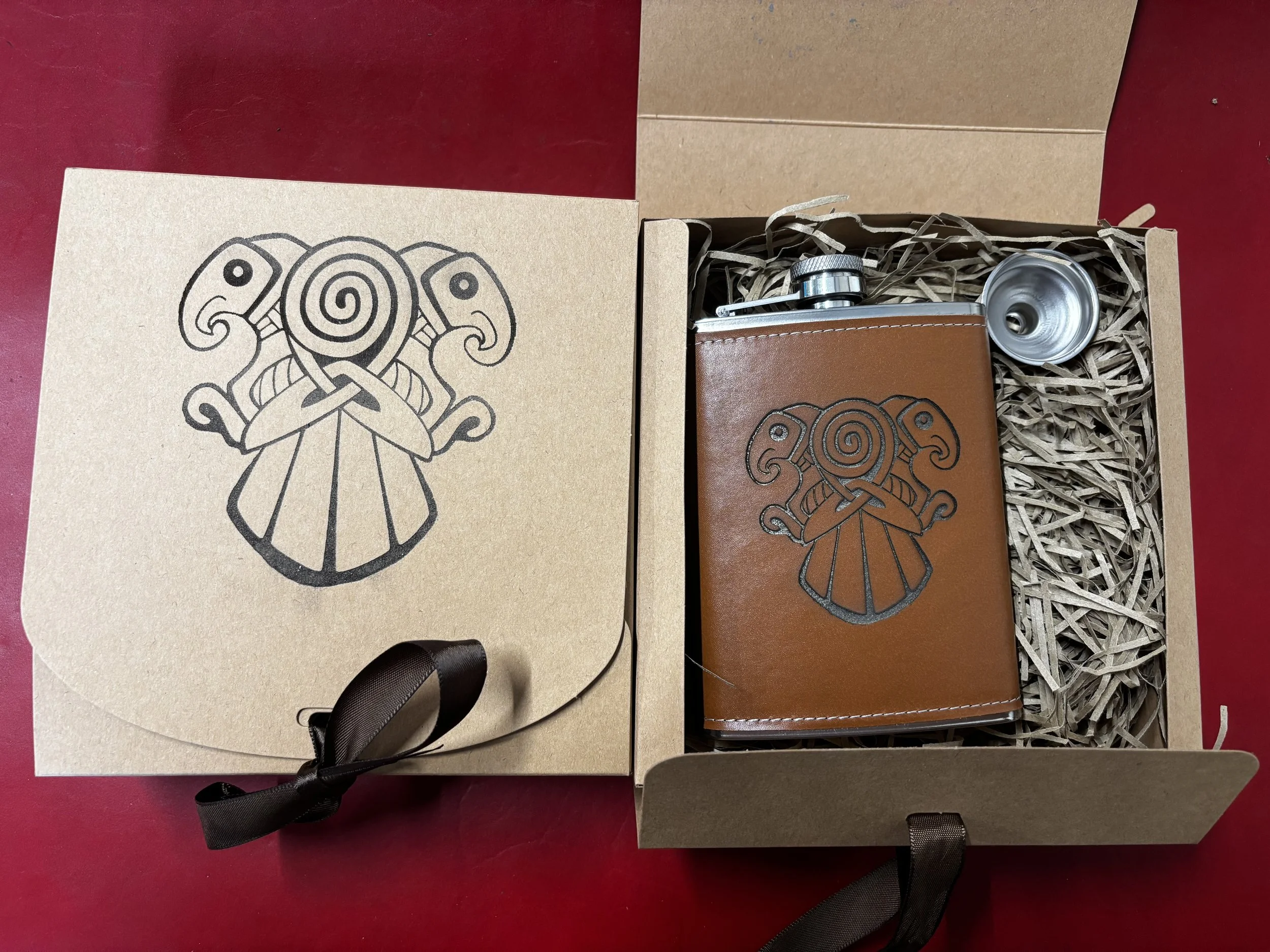 Each box comes complete with an engraved flask, funnel, and a brief description/ history of the artwork depicted on the flask and the matching box